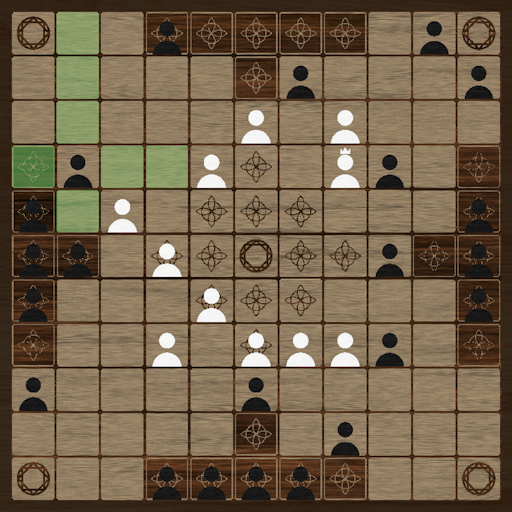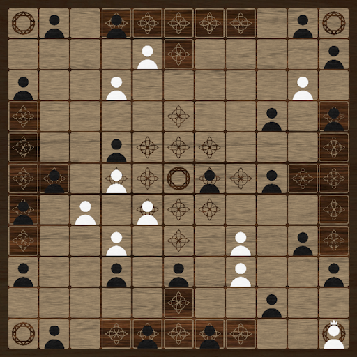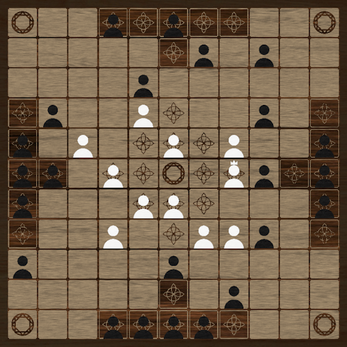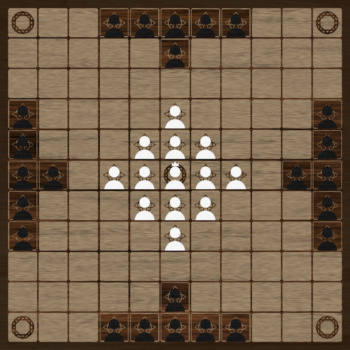 While there are several versions of tafl games, this version consists of an 11x11 board, with 24 attackers around the edges of the board, and 12 defenders circling a King in the center of the board. The rules of hnefatafl are somewhat inconsistent, but each ruleset consists of the same ways to win: